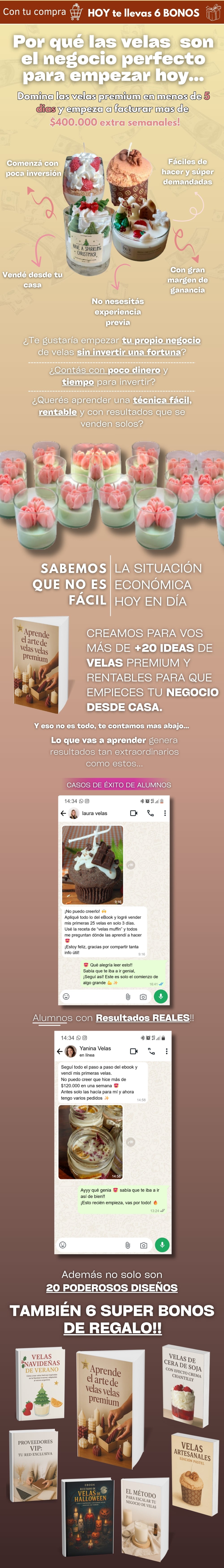 Empecé haciendo velas para mis amigas, y ahora tengo una línea completa de velas premium. Con las estrategias del ebook y los bonos, aprendí a poner precios y promocionar. Hoy tengo pedidos todas las semanas.